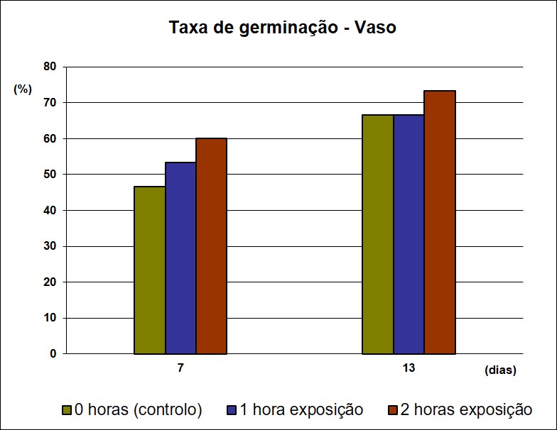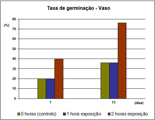 A taxa de germinação das sementes de A. thaliana mostra que a exposição às radiofrequências (1 h e 2 h) torna o processo mais rápido, pois um maior número de sementes já tinha germinado ao fim de 7 dias. Esta taxa de germinação só foi igualada/aproximada ao fim de 13 dias, nas sementes sem exposição a radiofrequências (grupo de controlo).
